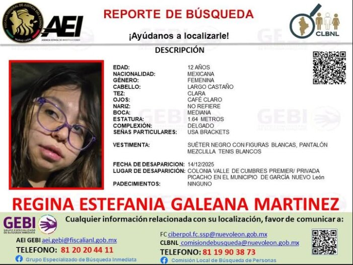 La familia de Regina Estefanía Galeana Martínez, una menor de 12 años, se encuentra desesperada después de que la jovencita desapareciera el domingo por la noche en la colonia Valle de Cumbres Premier, en el municipio de García, Nuevo León.
