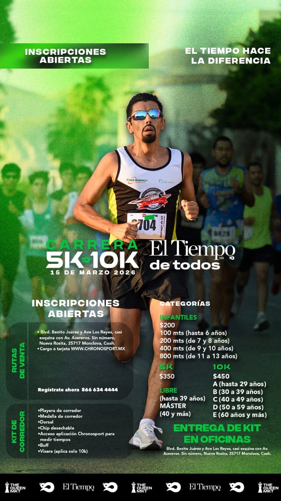 El domingo 15 de marzo de 2026 será la fecha para la carrera 5K y 10K organizada por el periódico El Tiempo de Monclova. Las inscripciones permanecen abiertas con costos que van desde los 200 hasta los 450 pesos, e incluyen un kit de corredor con varios obsequios.