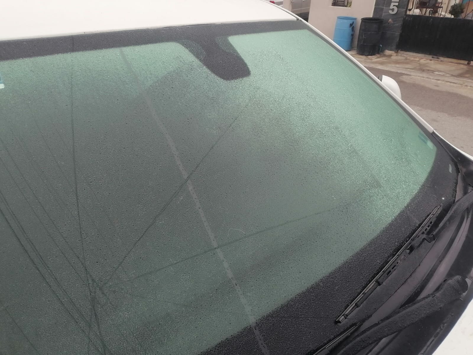 Los autos tiene una ligera cubierta de hielo en los parabrisas lo mismo que las plantas, rejas y toda cubierta húmeda debido a las condiciones climatológicas.